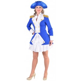 Déguisement officier de la garde bleu cobalt femme luxe : ce déguisement officier de la garde femme voir vidéo est un manteau d'officier bleu cobalt et blanc avec broderies or en tissu qualité supérieure (jupe, pantalon, chapeau non inclus), déguisement adulte pour carnaval, fêtes à thème uniforme, histoire, fêtes déguisées.