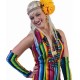 Déguisement femme qui comprend une combinaison style années 70 avec pattes d'éléphant en tissu à rayures motifs zig zag en dégradé de couleurs fuschia, orange, bleu turquoise, jaune, vert, bustier avec col pelle à tarte et ruches avec fermeture éclair, une paire de mitaines longues assorties. (autres accessoires non fournis)..