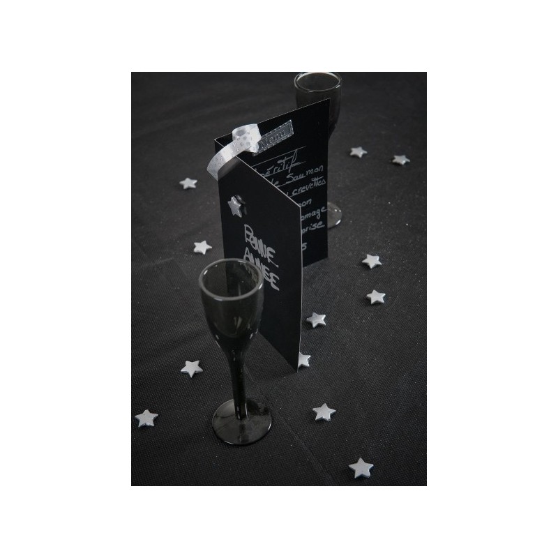 Idée déco petite étoile or et petite étoile argent à parsemer sur la table, pour décorer menu, carte, centre de table, boule transparente, goutte d'eau... thème gourmand, sous les étoiles, nuit magique, cinéma, festival du film, star, argent et noir, or et noir, design, princesse.