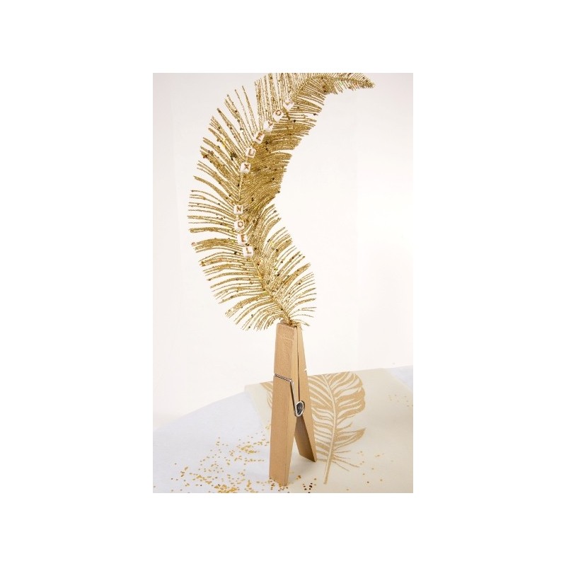Idée de Présentation : pince Pyramide or géante en bois à poser debout ou couchée à personnaliser, à utiliser en porte-menu pour présenter le menu de fête : menu de noël ou réveillon nouvel an, menu de mariage ou anniversaire, menu de la St Valentin... pour annoncer une fête ou la souhaiter, en plan de table, en centre de table, en porte-fleur pour une déco originale et chic, en support de contenant à dragées, pour la déco d'intérieur pour créer une ambiance féerique.