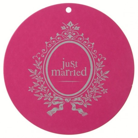 Marque place just married rond à personnaliser avec 1 face de couleur fuschia rose pink en carton brillant qualité deluxe avec inscription des lettres just married en gris foncé et motif médaillon baroque réhaussé de fleurs et d'un noeud de couleur gris foncé et 1 face (dos) de couleur fuschia avec pointillés gris pour écrire, marque place perforé pour l'attacher ou le suspendre à l'aide de fil métallique ou ruban pour une déco sublime.