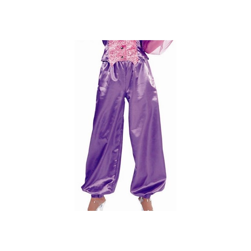 Costume de déguisement harem 1001 nuits deluxe femme qui comprend une superbe veste bustier raffinée de couleur violet et rose en satin épais et tissu brocart d'excellente qualité à manches longues, bustier de toute beauté avec devant en tissu brocart de couleur rose réhaussé de motifs arabesques brodés de couleur argent et coupe en pointe, fermeture sur le devant par 5 boutons de couleur argent, taille avec un ruban de chaque côté en satin violet à nouer au dos (voir vidéo) manches en voile d'organdi avec haut réhaussé d'un petit volant en tissu brocart rose brodé de motifs arabesques de couleur argent, bas des manches en tissu brocart rose motifs arabesques de couleur argent, un pantalon de danseuse de harem long et bouffant en satin épais de couleur violet avec bas serré et taille élastiquée, une toque (pillbox) avec voile en satin violet avec tour en tissu brocart rose réhaussé de motifs arabesques de couleur argent et voile en organdi violet d'excellente qualité.(Autres accessoires non fournis.)