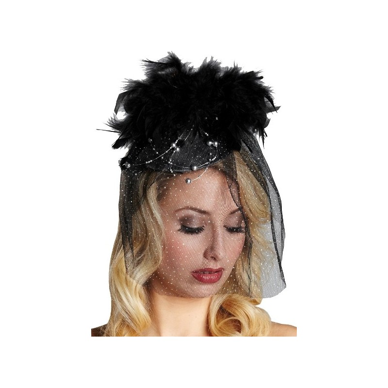 Chapeau chic noir à voilette perles plumes femme : ce chapeau chic noir femme élégant est orné de perles d'argent filées, de marabouts noirs et d'un voile en tulle brillant avec 2 clips pince à cheveux, accessoire déguisement adulte pour carnaval, bal masqué, fêtes déguisées.