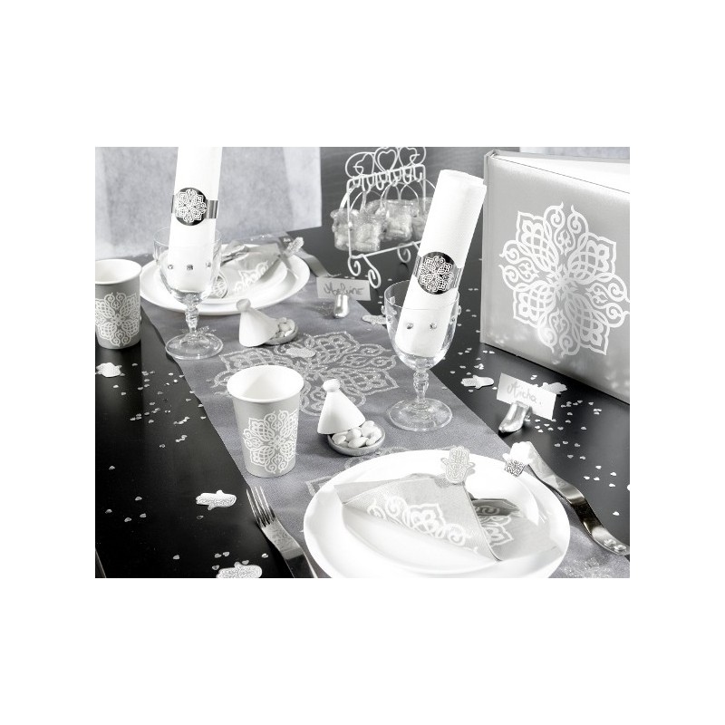 Gobelet carton de couleur argent réhaussé de motifs orientaux arabesques de couleur blanc et de couleur blanc à l'intérieur d'excellente qualité pour une ambiance de fête ou de mariage réussie, gobelet jetable à compléter avec le chemin de table oriental, assiette motif oriental carton argent, serviette de table en papier orientale, livre d'or argent oriental, housse de chaise argent, nappe argent, noire, fuschia ou blanche pour une déco de table somptueuse !