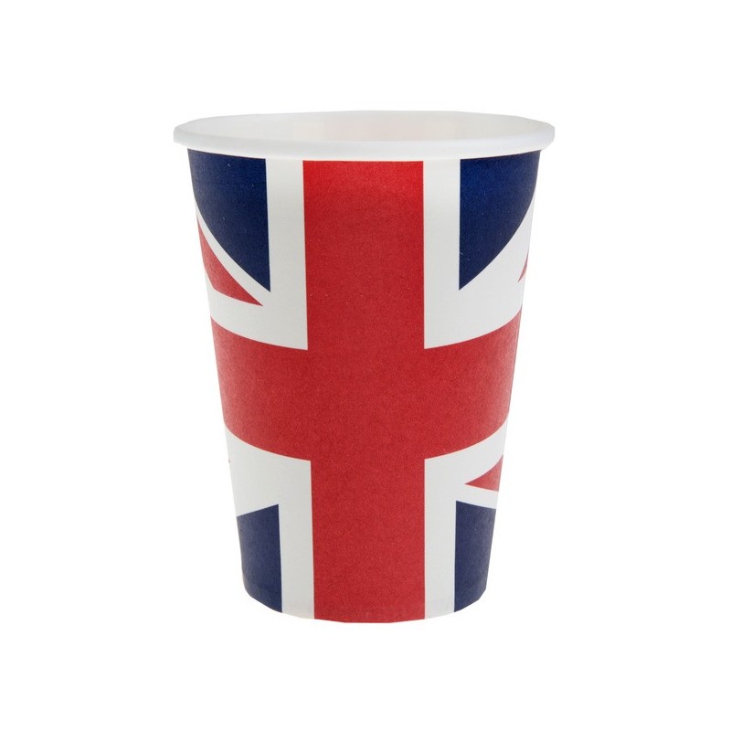 Gobelet carton imprimé drapeau Anglais Union Jack aux couleurs du drapeau Anglais du Royaume uni et de couleur blanc à l'intérieur d'excellente qualité pour une Ambiance de Fête Réussie, ils s'accorderont à merveille avec une nappe intissé unie, à compléter avec la collection Angleterre ou london party.