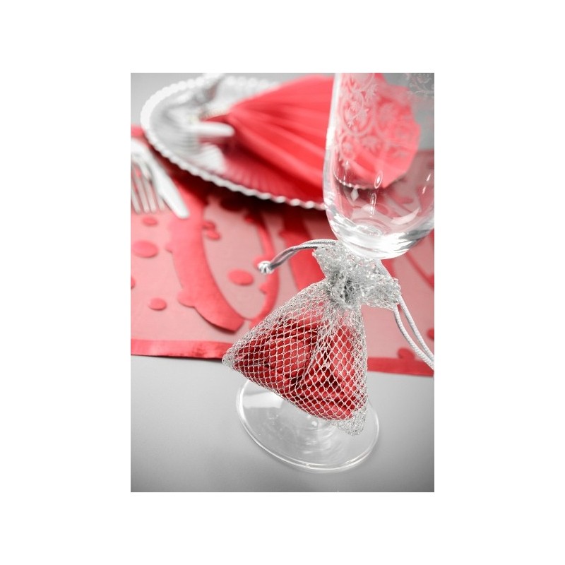 Sachet à dragées nid d'abeille de couleur argent en forme de bourse en tissu polyester résille transparent aux fines mailles avec liens argent en tissu pour le fermer, sachet dragées à utiliser pour créer et présenter avec élégance vos compositions de dragées ou confiserie.