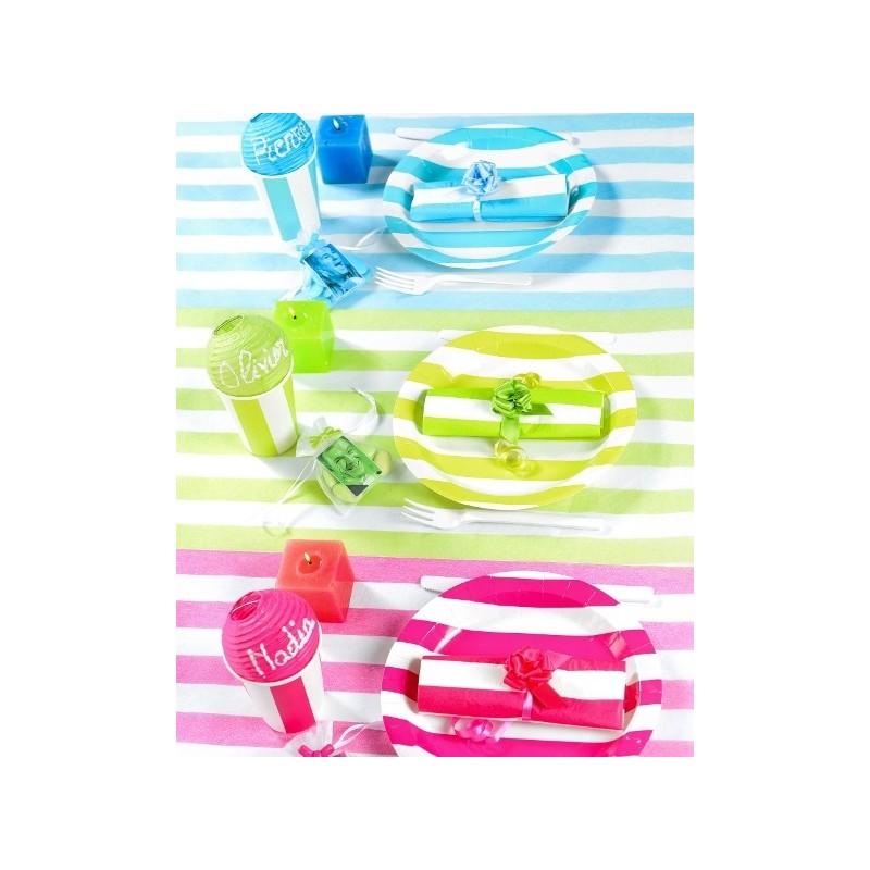Sachet de 10 assiettes rayées carton vert anis blanc rondes. (autres accessoires non fournis.)
