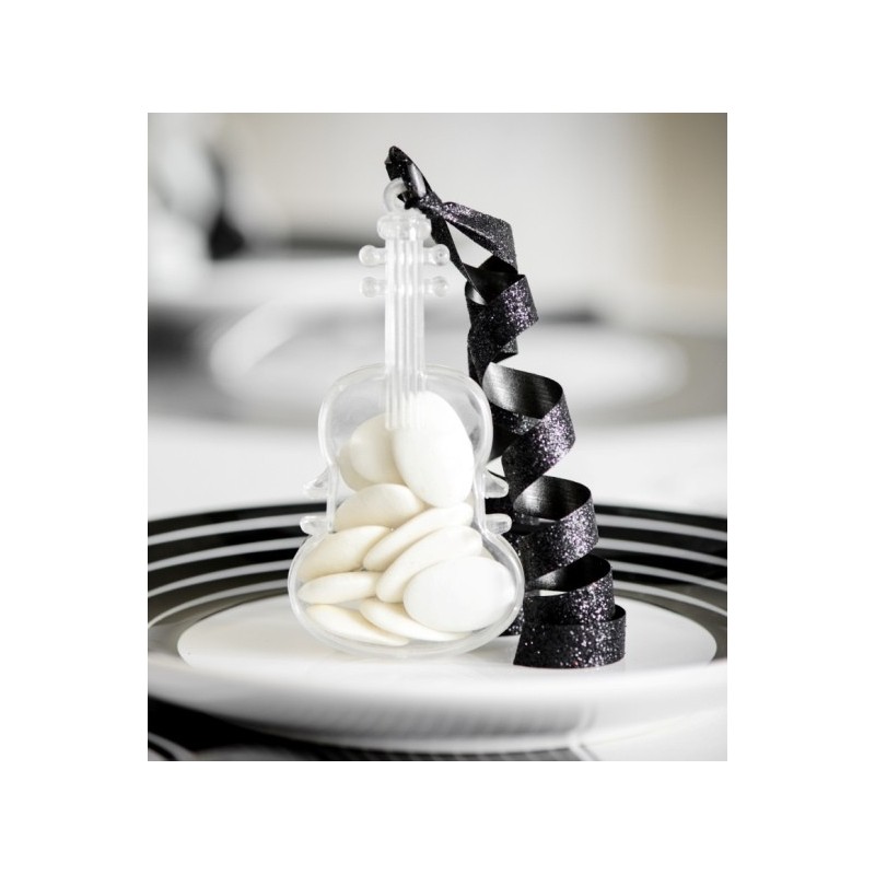 Boite à dragées guitare transparente à garnir de dragées ou confiserie pour 6 à 12 dragées de 15 à 20 grs environ, chocolat ou confiserie pour baptême, mariage et fêtes à thème musique.