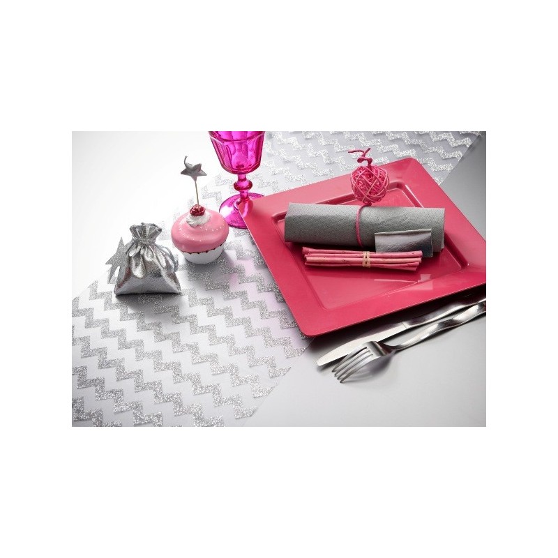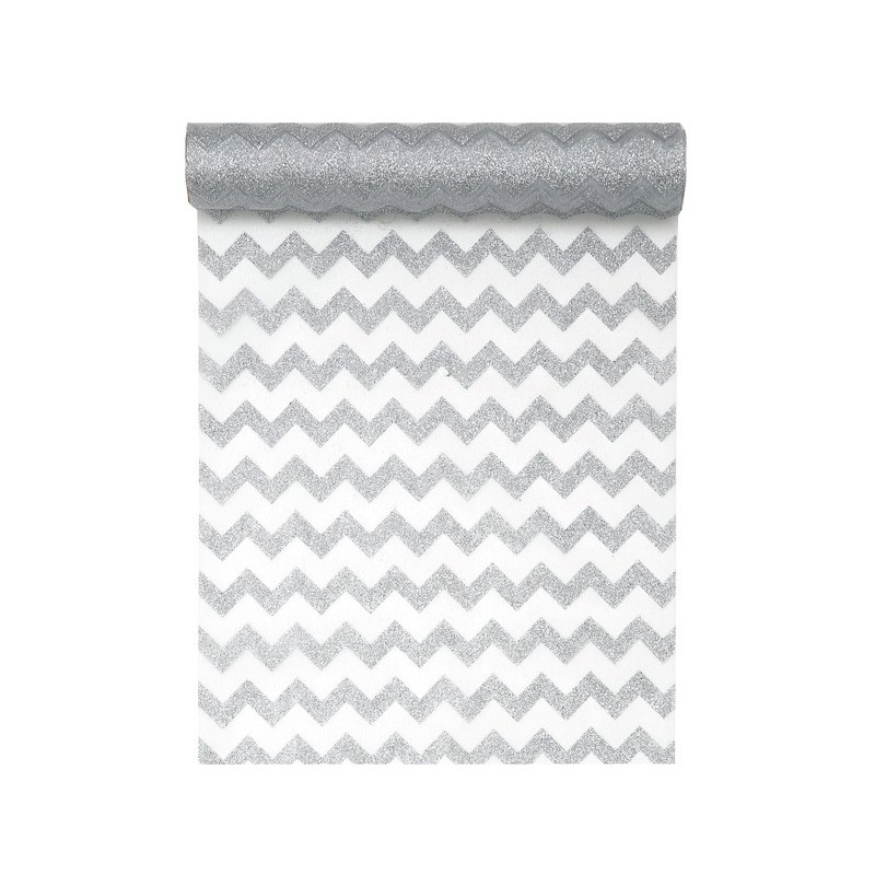 Sachet d'1 Chemin de table chevron argent pailleté en tissu organdi blanc argent, livré en rouleau. (autres accessoires non fournis.)