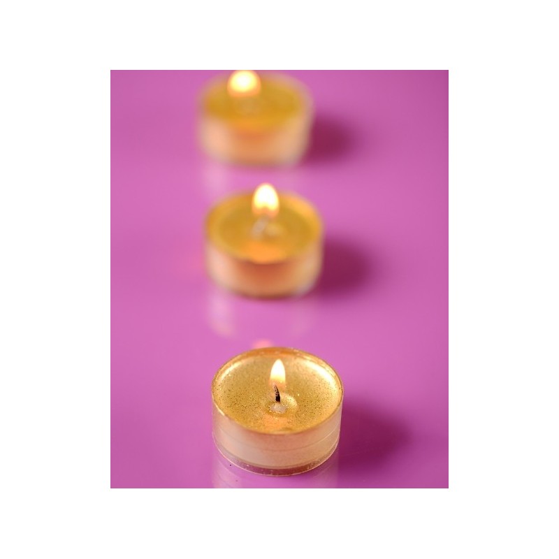 Lot de 40 bougies chauffe plat or pailleté rondes avec coque transparente livrées et présentées dans boîtes transparentes. (autres accessoires non fournis)