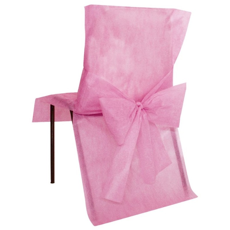 Housses de Chaise Intissé Rose avec Noeuds Intissé Rose en Tissu Non Tissé Uni (tissu Intissé) à usage unique pour tout types de Chaise standard, Sachet de 10 Housses de Chaises intissé rose avec noeuds et Lacets de Fixation.