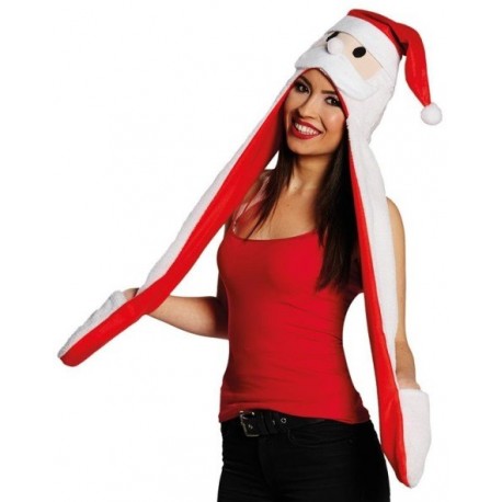 Bonnet de Noël adulte rouge et blanc en tissu avec visage du père Noël, une écharpe longue attachée en tissu blanc et rouge qui recouvre les oreilles, écharpe avec une grande poche blanche de chaque côté qui sert de mitaines, pompon blanc à l'extrémité du bonnet, accessoire déguisement de Noël.