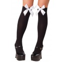Paire de bas noirs opaques en nylon avec un noeud satin blanc sur le devant, bas élastiqués.