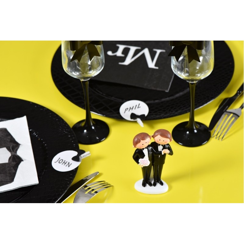 Figurine Mr & Mr Couple de mariés hommes. Sachet d'1 Figurine Mr & Mr Couple de mariés hommes en costume noir 10 x 5 cm en polyrésine pour décoration Mariage. Idée pour déco de table à thème Mr & Mr, déco gâteau, déco pièce montée, mariage chic et design, déco stylée.