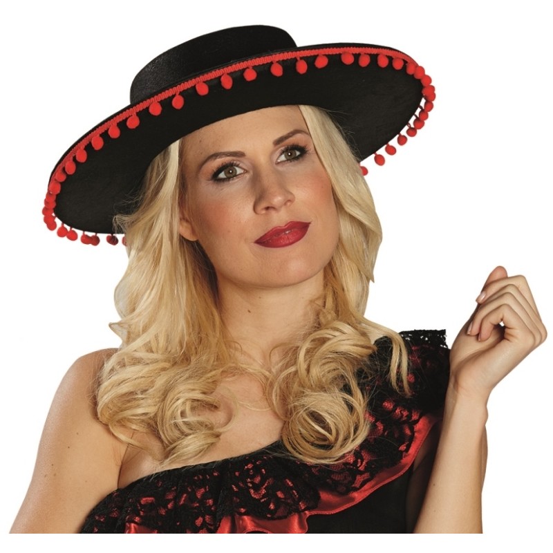 Chapeau espagnol adulte : ce chapeau espagnol adulte femme et homme est de couleur noir avec pompons rouges, tour du chapeau avec ruban satin rouge, accessoire déguisement espagnol flamenco parfait pour un anniversaire, carnaval, fêtes déguisées.