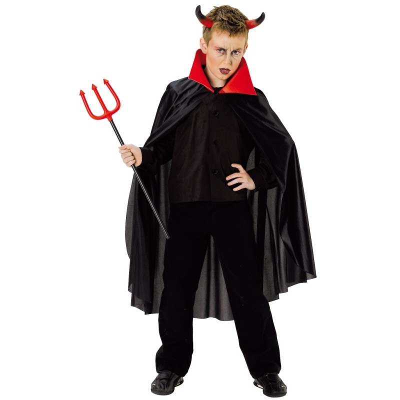 Ce déguisement diable enfant comprend : une cape longue noire en tissu, cape ouverte devant avec fermeture au niveau du cou par bouton, revers du col en tissu rouge.