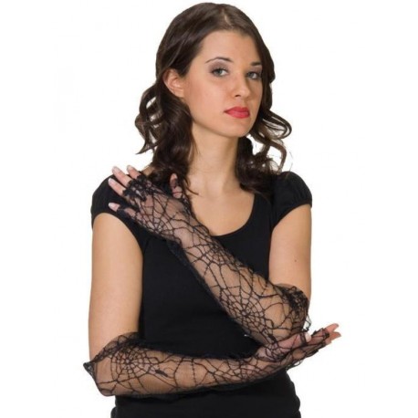 Cette paire de mitaines longues sont en tissu noir transparent à motifs toiles d'araignée avec araignées noires, mitaines qui recouvrent le coude, les mains et laisse apparaître les doigts, confortables et agréable à porter, accessoire déguisement à porter seul ou pour compléter votre déguisement pour un look stylé.