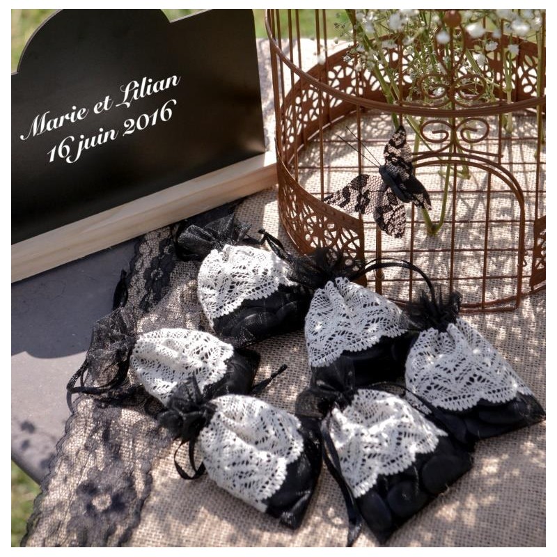 Sachets à dragées organdi noir dentelle ivoire les 4