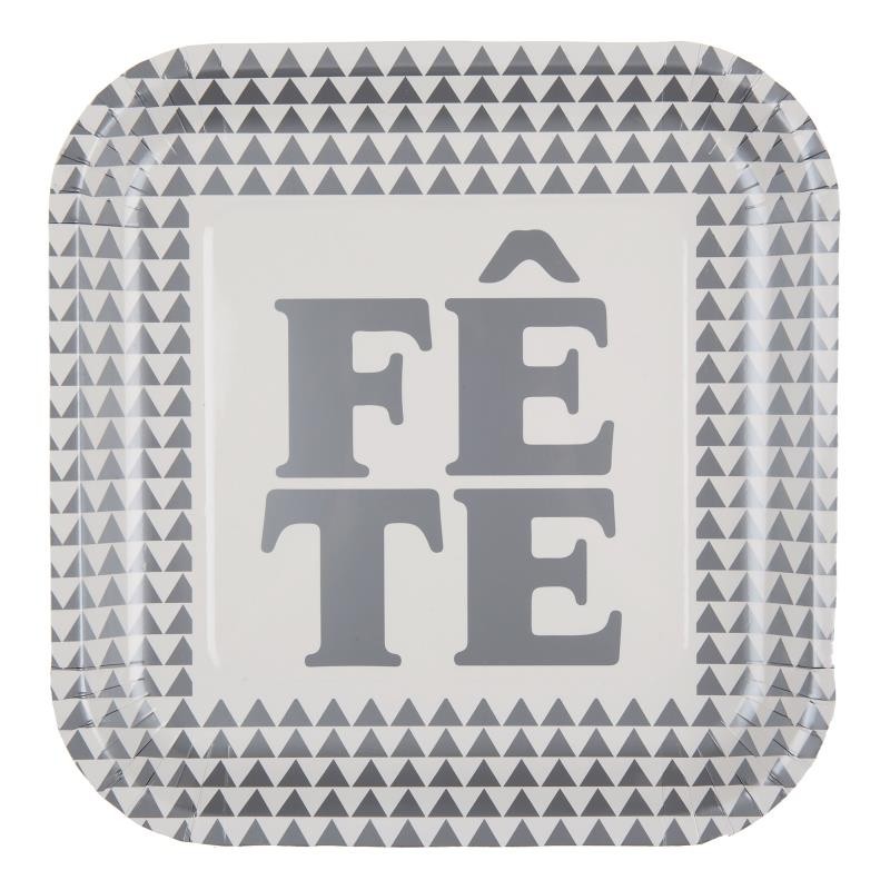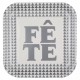 Ces assiettes Fête sont en carton couleur argent et blanc, plates, carrées, décor avec inscription Fête couleur or, assiettes jetables avec rebord en carton brillant d'excellente qualité, parfaites pour créer une décoration de table chic et stylée.