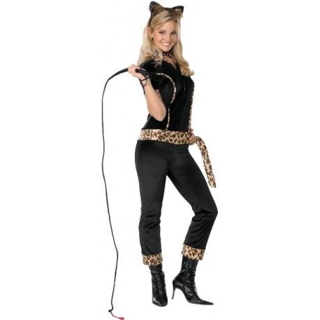 Déguisement Katty la Dompteuse ados et jeune femme qui comprend une combinaison noire en tissu velours à manches longues, devant de la combinaison réhaussé de liserés à motifs panthère, dos de la combinaison avec une queue de panthère marron en tissu doublé attaché, une ceinture attachée en tissu imprimé panthère à nouer sur le devant, bas de la combinaison avec revers imprimé panthère marron, combinaison à fermeture éclair sur le devant, un serre-tête avec oreilles de panthère marron. (Autres accessoires et fouet non fournis).