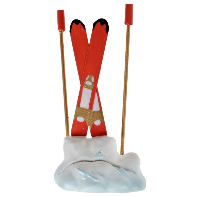 Marque place paire de skis x 1 : ce marque place paire de skis rouges dans la neige avec bâtons de 10.4 x 5.5 cm est en polyrésine avec encoche pour insérer carte ou étiquette. Idée pour décoration de table festive, anniversaire, baby shower, Noël, fêtes, nouvel an, thème neige, hiver, ski, montagne.