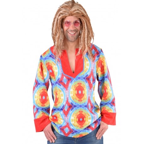 Ce déguisement hippie homme comprend : une chemise multicolore à motifs batik en tissu à manches longues, chemise avec col en tissu rouge et revers des manches en tissu rouge, fermeture à boutons.