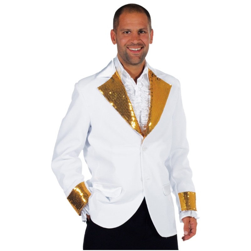 Déguisement veste blanche paillettes sequin or homme luxe : ce déguisement veste blanche paillettes sequin or (colbert) classe est en tissu et sequin qualité supérieure. Costume adulte pour cabaret, carnaval, show, music hall, fêtes déguisées, spectacle, réveillon du 31.
