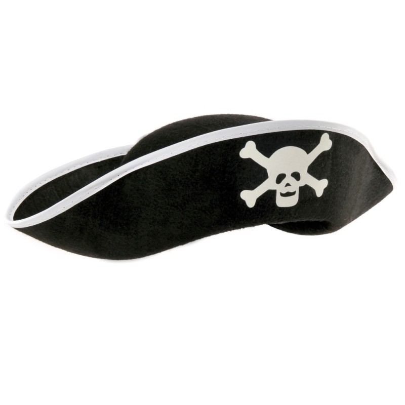 Ce chapeau pirate est de couleur noir en feutrine polyester, motif tête de mort blanche à l'avant, contour du chapeau avec liseré blanc.