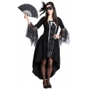 Ce déguisement femme comprend : une robe noire style bal masqué à manches longues en tissu, tulle et velours, bustier avec noeud en tissu argent, milieu de la robe en tulle à motifs argentés et liseré argent, robe courte devant et longue au dos, manches à volant en tulle noir à motif dentelle avec liseré argent, fermeture zip au dos de la robe.