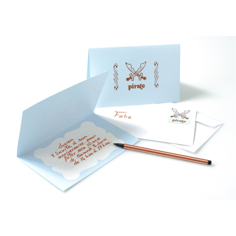 Ces cartes pirate sont en carton glacé couleur bleu ciel avec dessin couleur chocolat, intérieur de la carte avec encadré de couleur blanc à personnaliser, cartes à utiliser en invitation, faire-part ou en menu de fêtes pour une déco stylée.