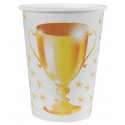 Ces gobelets tennis sont en carton blanc cassé et jaune or, décor coupe style trophée avec étoiles, intérieur du gobelet de couleur blanc, gobelets jetables parfaits pour une déco de table stylée.