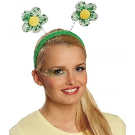 Serre-tête fleurs vertes femme : ce serre-tête fleurs femme est vert avec 2 fleurs vertes sur ressort, accessoire déguisement adulte et ado, à porter à l'occasion du carnaval, fêtes déguisées, thème hippies, cirque, fleurs, animaux.