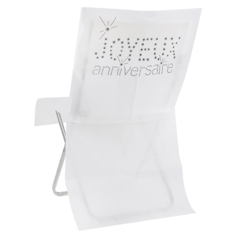 Housses de chaise anniversaire intissé blanc les 6 : ces housses de chaise anniversaire intissé blanc et noir, inscription joyeux anniversaire sont en tissu non tissé 50 x 95 cm pour décoration de chaise, convient pour tous types de chaises en taille standard, idée déco anniversaire chic et stylée.