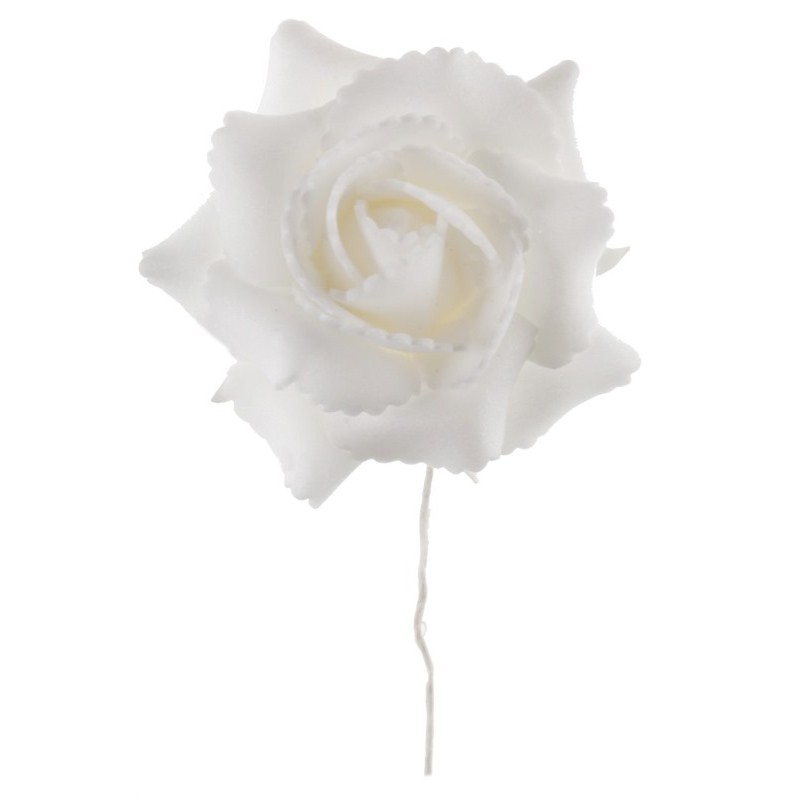 Roses blanches sur tige les 4 : ces roses blanches sur tige sont des fleurs artificielles en plastique de ø 5.5 x 9 cm sur tige flexible, roses artificielles à utiliser en bouquet, fleur à dragées ou en déco pour contenants à dragées, composition florale, décoration de table, anniversaire, baptême, mariage, fêtes, déco d'intérieur.