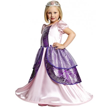 Ce déguisement de princesse comprend : une robe longue rose et violette à manches courtes en tissu satiné et tulle, bustier rose et violet à motifs brocart, manches bouffantes, taille avec petites roses violettes en tissu cousues, une surjupe courte en tulle à liseré violet, une surjupe courte violette à motifs brocart argent, jupe rose, bas de la robe avec cerceau, robe à fermeture zip.