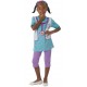 Ce déguisement Disney fille comprend : une tunique bleue à manches courtes en tissu, tunique à motifs pattes d'animaux de couleur rose sur le devant et les manches, un gilet blanc attaché sur le devant en tissu avec logo Doc Mc Stuffins sur un côté, un pantalon court style leggings parme en tissu, taille élastiquée, un serre-tête style bandeau violet avec fleur avec fermeture à scratch, un stéthoscope en feutrine avec scratch pour l'attacher sur la tunique.