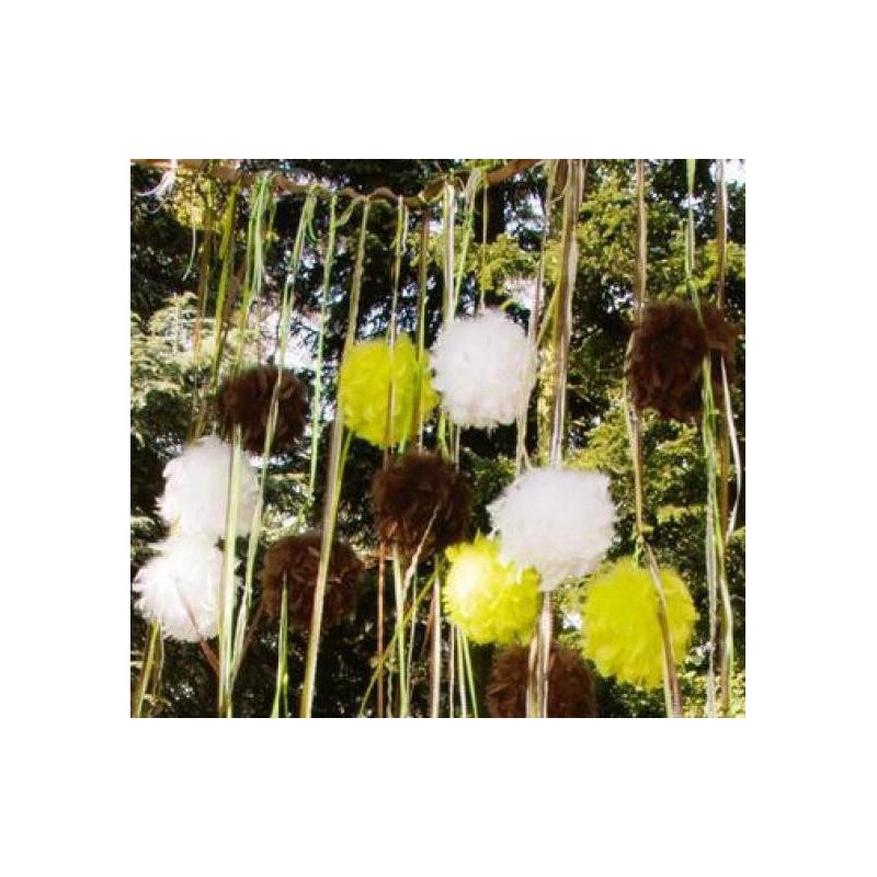 Boule de plumes décorative blanche, fuchsia, noire, vert anis, chocolat au choix avec ruban satin pour décoration d'intérieur, déco anniversaire, baptême, Noël, fêtes et mariage.