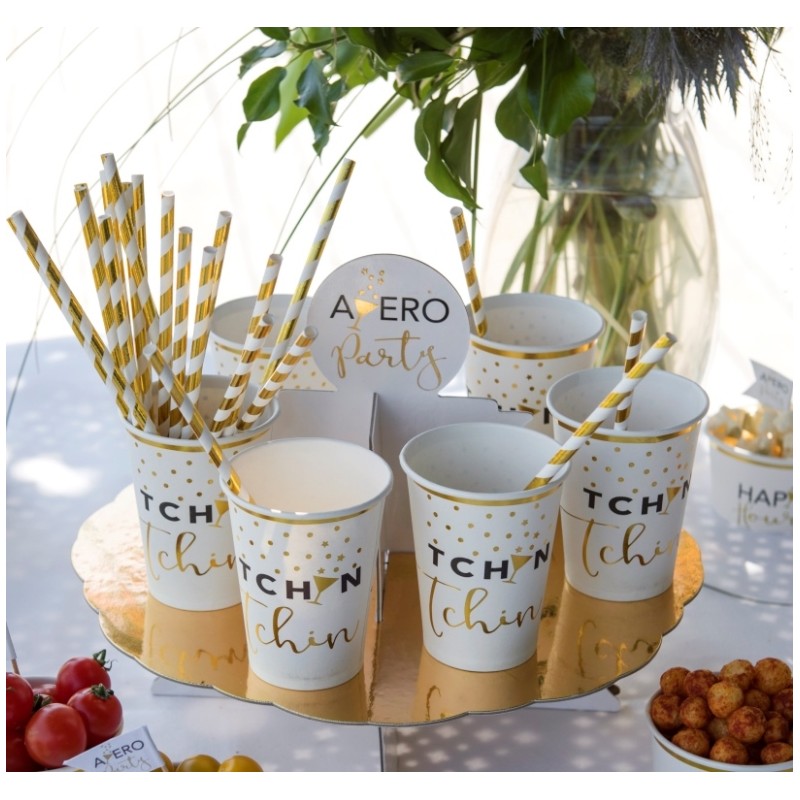 Ces gobelets apéro sont en carton blanc cassé, or et noir, décor inscription tchin-tchin avec coupe et pois or, intérieur du gobelet de couleur blanc, gobelets jetables parfaits pour une déco de table stylée.