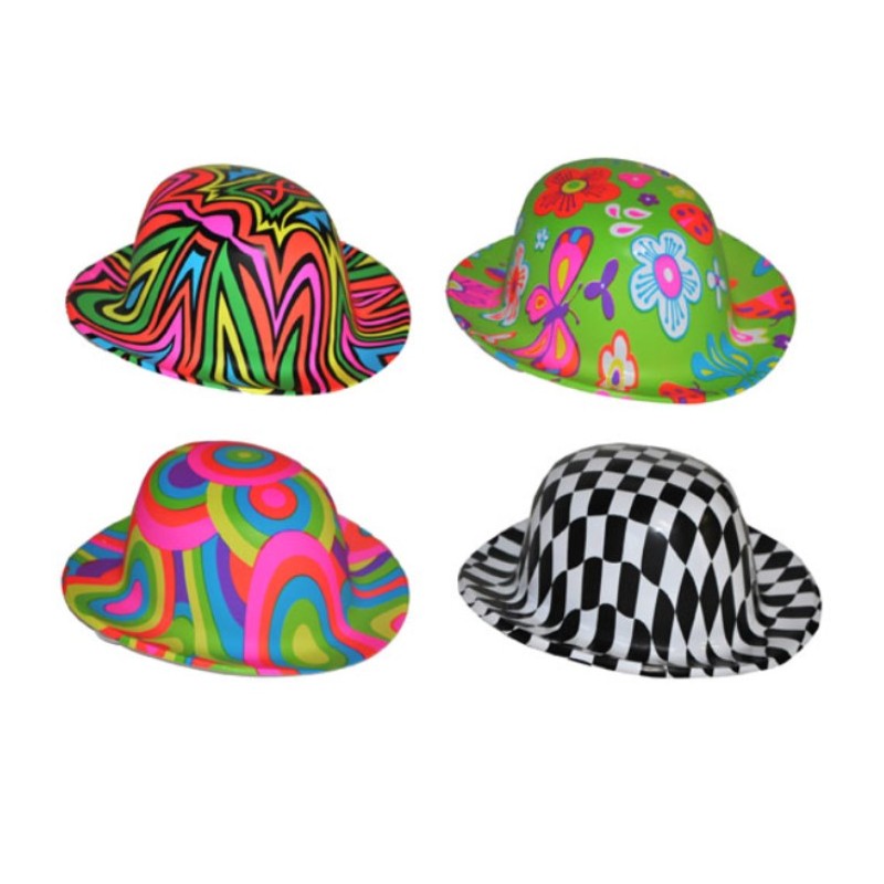 Chapeau melon en plastique de 22 cm aux couleurs et motifs assortis, accessoire déguisement à porter seul ou pour compléter votre déguisement pour un look stylé.
