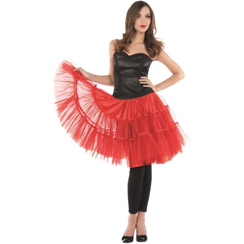 Déguisement jupe tulle rouge femme : ce déguisement jupe tulle rouge à volants style jupon est tout en volume en tulle et satin, à porter avec un leggings ou en jupon pour ajouter du volume à une jupe ou robe pour un look stylé. Idée pour cabaret, carnaval, danse, fêtes et soirées déguisées, spectacle, thème années 60-70-80.