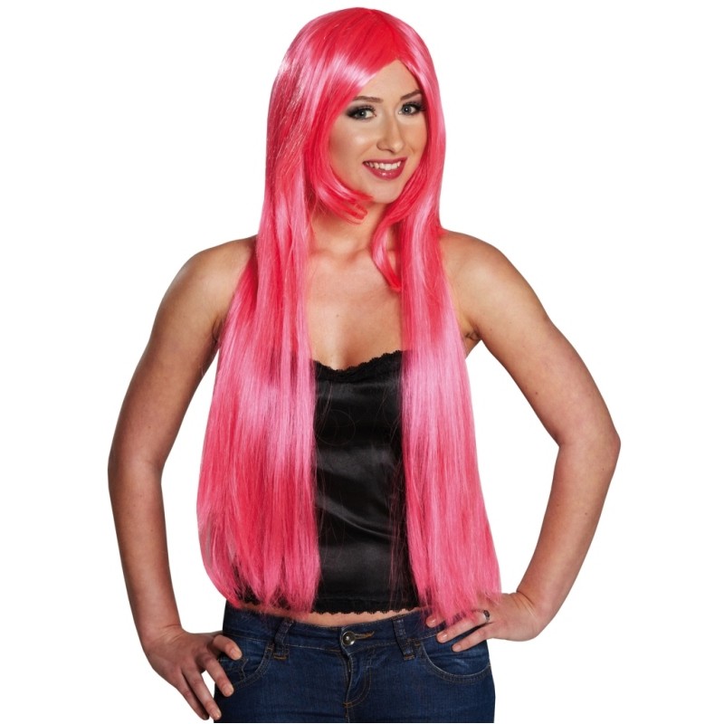 Perruque longue rose femme : cette longue perruque femme est fluo rose coupe stylée aux cheveux lisses avec cheveux plus courts à l'avant qualité luxe, accessoire déguisement adulte, perruque rose femme parfaite pour carnaval, fêtes déguisées, spectacle, thème fée, princesse.