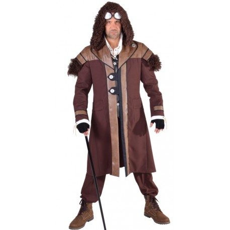 Ce déguisement steampunk homme comprend : un manteau à capuche long marron, brun et noir à manches longues en tissu et imitation cuir, revers du col imitation cuir avec bouton, capuche ample avec fausse fourrure brun, épaules avec fausse fourrure brun foncé, devant du manteau avec tissu noir et imitation cuir, boutons argent avec attaches en tissu noir, côté avec 2 fausses poches, bas des manches avec pièce en tissu imitation cuir.