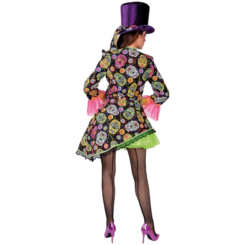 Ce déguisement femme comprend : une veste queue de pie noire et couleur à manches longues en tissu, dentelle, tulle et satin, col avec revers en satin noir et liseré vert, veste avec motifs et têtes de mort Skull (Calavera) en couleur, bas des manches à volant en tulle fuchsia avec ruban satin orange, queue de pie coupe stylée avec un coté plus court, bas en dentelle noire, fermeture à boutons.
