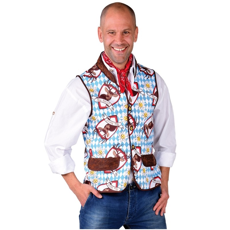 Ce déguisement tyrolien homme comprend : un gilet style veste damier bleu et blanc sans manches en tissu, revers du col et des poches en tissu imitation cuir suédine brun, gilet à motifs fleurs d'edelweiss, cerfs avec inscription Alm hirsch, fermeture à boutons sur le devant.