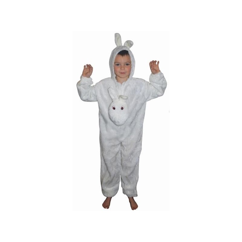 Ce déguisement lapin comprend une combinaison de lapin en tissu peluche douce de couleur blanche à manches longues, une capuche intégrée à la combinaison en forme de tête de lapin avec oreilles sur le dessus de la tête, une peluche en forme de tête de lapin attachée sur le devant en peluche blanche avec intérieur en mousse, une queue de lapin en peluche et intérieur mousse attachée à la combinaison, combinaison très confortable avec fermeture sur le devant.