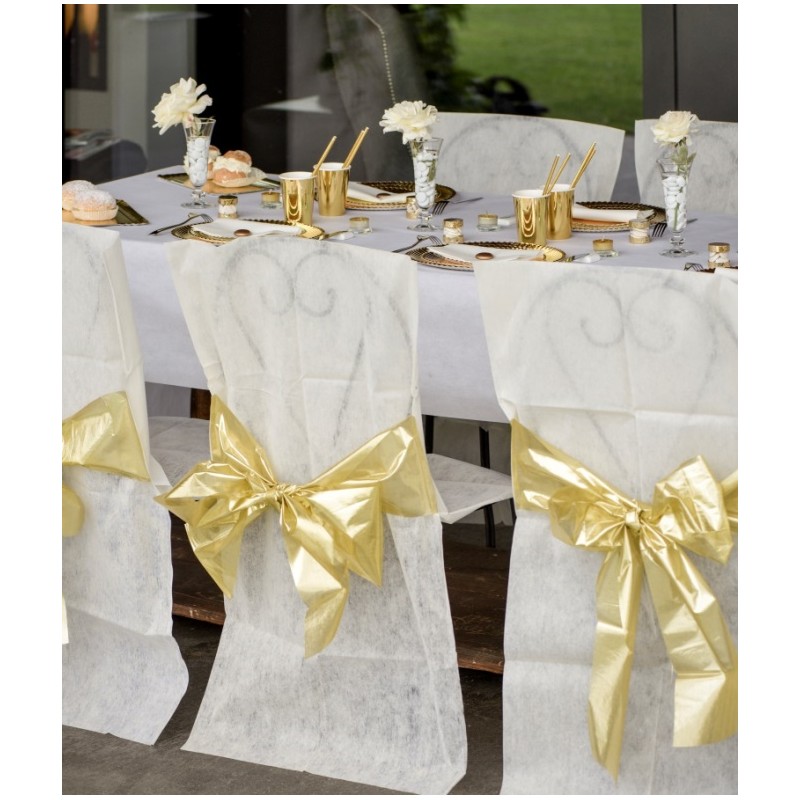 Ces housses de chaise ivoire avec noeud or métallisé sont en tissu non tissé uni (intissé), pratique et facile à mettre sur les chaises, convient pour tous types de chaises standard.