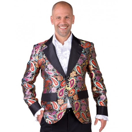 Déguisement veste brocart paisley homme: ce déguisement veste brocart paisley homme chic est une veste Colbert brocart à motifs couleur avec revers satin noir en tissu qualité supérieure (chemise et pantalon non inclus), déguisement Colbert brocart adulte pour fêtes déguisées.