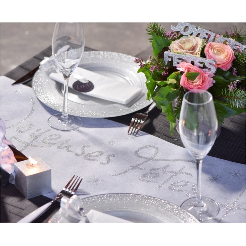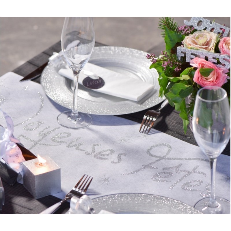 Chemin de table joyeuses fêtes blanc et argent : ce chemin de table joyeuses fêtes blanc et argent intissé de 5 M x 30 cm est en tissu non tissé pailleté chic, chemin de table parfait pour déco de table festive, fêtes de fin d'année, réveillon du 31.