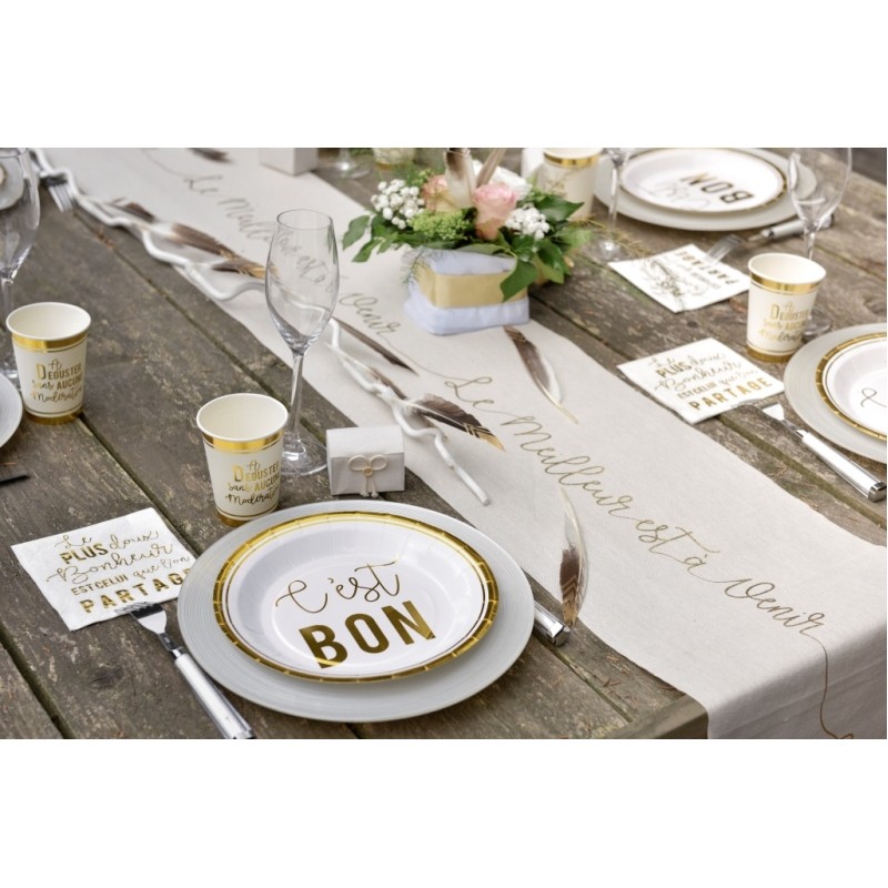 Chemin de table petits bonheurs : ce chemin de table petits bonheurs est en coton naturel, décor inscription le meilleur est à venir en lettres or, chemin de table de 3 M x 28 cm parfait pour créer une déco de table stylée, idée déco de table festive, baptême, anniversaire, mariage, dîner entre amis.