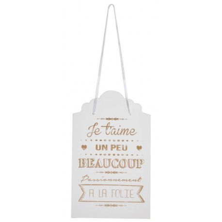 Pancarte je t'aime blanche x1 : cette pancarte je t'aime blanche est en carton de 46 x 28 cm, inscription je t'aime, un peu, beaucoup, passionnément, à la folie avec ruban satin blanc (vendue à l'unité), pancarte à suspendre ou à accrocher au mur pour décoration festive, mariage, événement festif.
